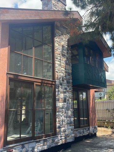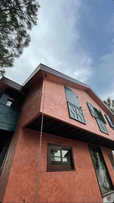 Yatak odasında ön cepheye açılan bir cumbası bulunan villada ahşap doğramalar kullanılarak yeşil renkte kepenk sistemi uygulanmıştır. Cephe, kırmızı tonlarda dekoratif sıva, yeşil ahşap kepenk ve ahşap alın uygulaması ile bütünleştirilmiştir.
